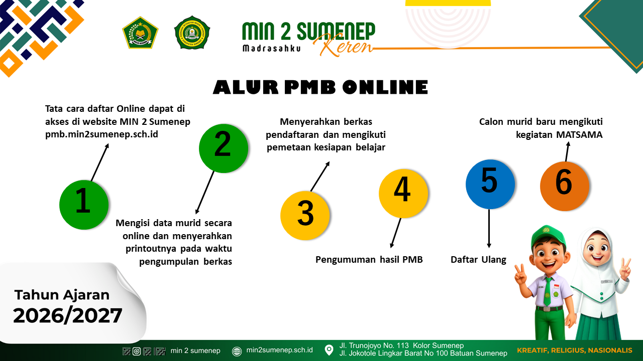 MIN 2 SUMENEP menyediakan PMB secara online diharapkan proses PMB dapat berjalan cepat dan bisa dilakukan dimanapun dan kapanpun selama sesi PMB Online dibuka. Proses pendaftaran calon murid baru dilaksanakan secara online dalam rangka menyongsong era madrasah digital. MIN 2 SUMENEP.